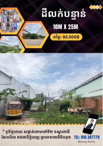 💥 #ដីលក់បន្ទាន់💥10m x 25m💥 ផ្លូវបេតុងមុខ-ក្រោយ 💥 🔹ល្អសម្រាប់ធ្វើឃ្លាំង ផ្ទះល្វែង ឬ ផ្ទះជួល 🔹 ✍️ តម្លៃពិសេស: 85,000$ ✍️ ទឹករដ្ឋ ភ្លើងរដ្ឋ ប្រពន្ធលូមានស្រាប់ និងជាទីប្រជុំជន់ 📍 សង្កាត់ចោមចៅទី២ ខណ្ឌពោធិ៍សែនជ័យ រាជធានីភ្នំពេញ ព្រលានពោធិ៍ចិនតុង Tel: 016 307779 https://t.me/Seng_Seila