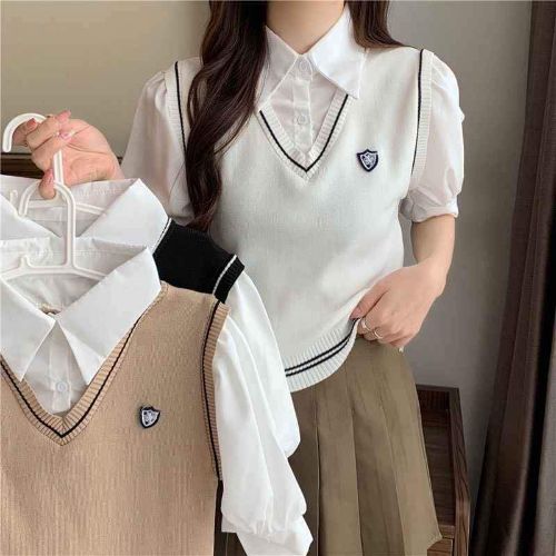 Dáng là áo len sát nách kết hợp áo sơ mi tạo nên phong cách thời trang hiện đại độc đáo.