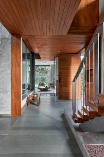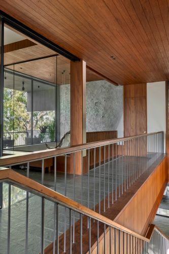 The House by the farm là nơi giao thoa giữa những khoảng không xanh mướt và không gian chức năng đa dạng như phòng khách, phòng ngủ... Từng ngóc ngách của căn nhà được xây dựng tinh tế từ kỹ thuật nội địa, giúp mọi người có sự riêng tư nhưng không tách biệt. Các khoảng không gian mở cho phép ánh sáng tự nhiên tràn vào lòng sân nhà mà vẫn lọc giảm được bức xạ mặt trời. Từng thành phần ở các độ cao khác nhau, mang lại sự dung hòa giữa con người, thiên nhiên và không gian.